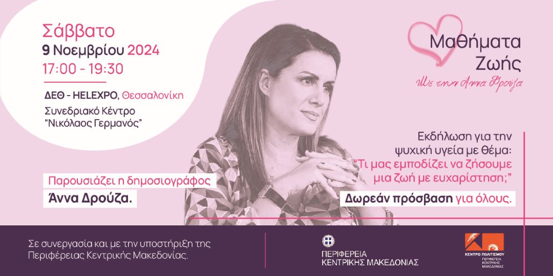 Το Σάββατο 9 Νοεμβρίου τα “Μαθήματα Ζωής” έρχονται και στη Θεσσαλονίκη, σε συνεργασία και με την υποστήριξη της Περιφέρειας Κεντρικής Μακεδονίας. Στόχος της εκδήλωσης, με θέμα «Τι μας εμποδίζει να ζήσουμε μια ζωή με ευχαρίστηση;», είναι να αναδείξει τα ζητήματα ψυχικής υγείας και αυτογνωσίας, δίνοντας στο κοινό την ευκαιρία να ενισχύσει την ψυχική του ανθεκτικότητα και να βελτιώσει την ποιότητα της ζωής του.